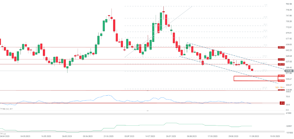 El trigo continúa su liquidación y cae al nivel más bajo desde mayo. Curiosamente, el RSI está cayendo a su nivel más bajo desde los mínimos de mayo y agosto, lo que podría sugerir una condición de sobreventa. Los niveles actuales se sitúan al mismo tiempo en torno a los máximos locales de 2018 y 2020. Una caída por debajo del mínimo de mayo podría indicar una voluntad de probar el rango de 550-565 centavos por bushel. Fuente: xStation5