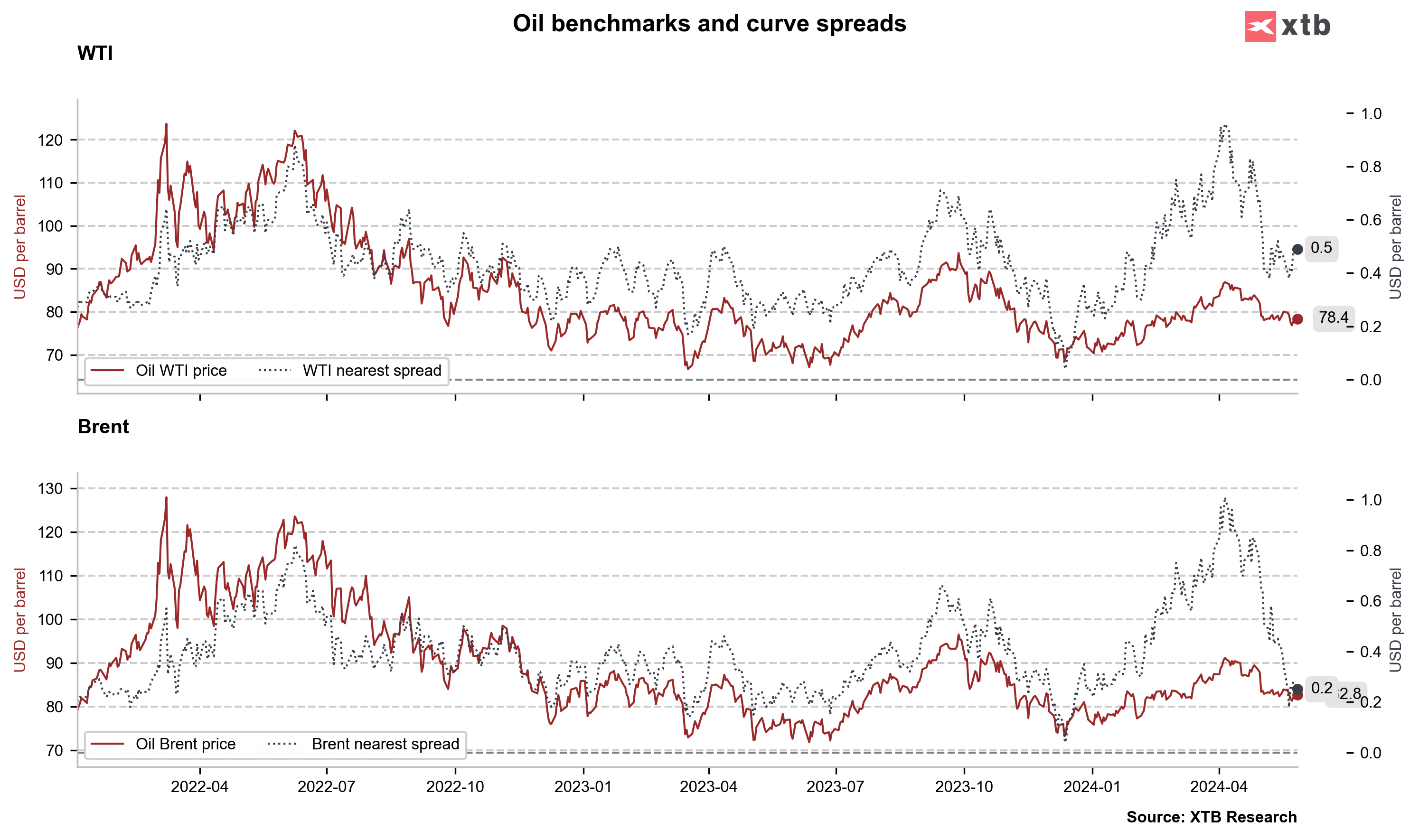 Los inventarios de petróleo en Estados Unidos están al mismo nivel que el año pasado. El aumento de los inventarios fue significativo, pero al mismo tiempo más lento de lo que sugiere el promedio de cinco años, por lo que las declaraciones sobre la debilidad de la demanda estadounidense pueden ser algo exageradas. Fuente: Bloomberg Finance LP, XTB