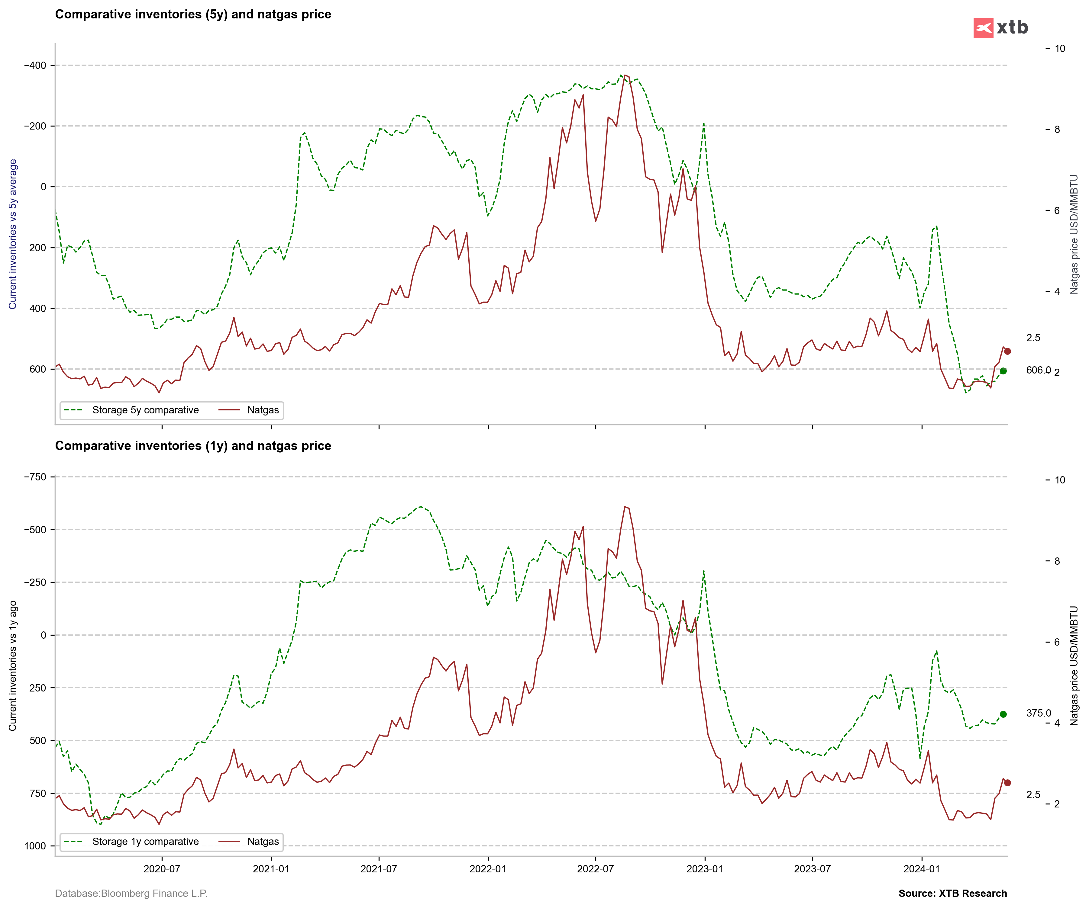 Los inventarios comparativos indican potencialmente la posibilidad de que continúe la tendencia alcista del gas natural, pero esto requeriría una demanda significativamente mayor en el futuro cercano. La mayor demanda asociada a la temporada de verano se producirá en julio y agosto. Fuente: Bloomberg Finance LP, XTB.