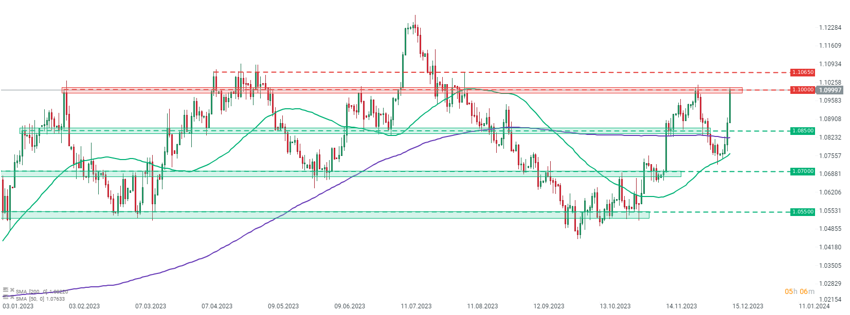 El Eurodólar subió hasta la zona de 1,10, impulsado por la postura agresiva del BCE y la postura moderada del FOMC. Fuente: xStation5