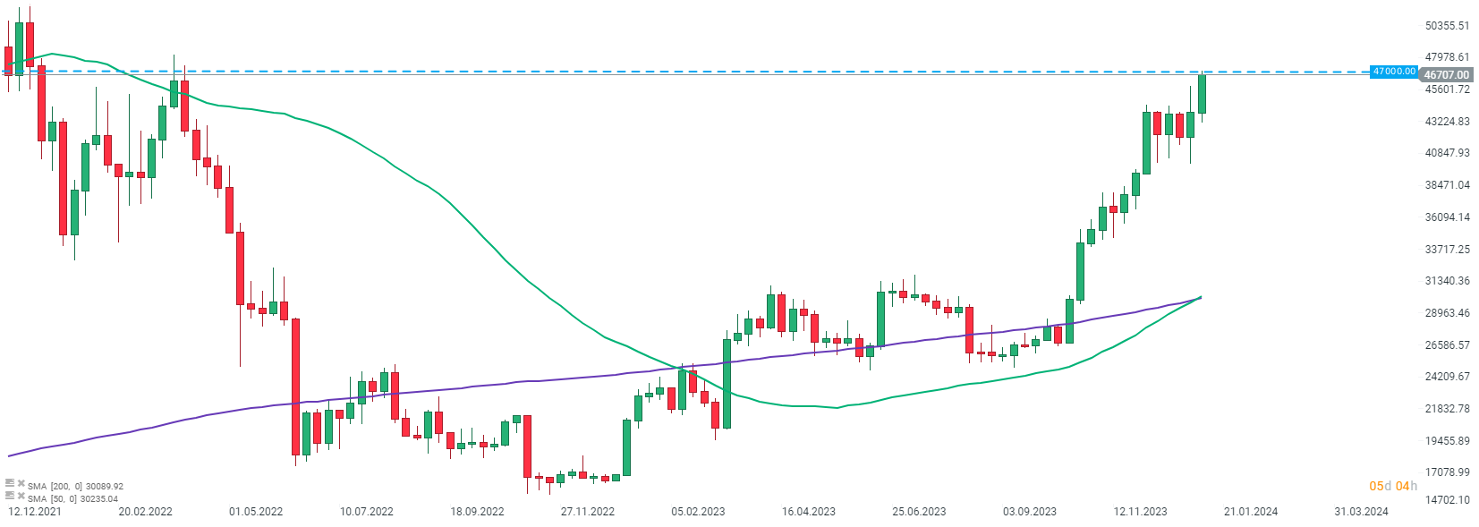Bitcoin se recupera un 7% y prueba el área de $47,000 con la esperanza de una decisión sobre el ETF al contado de Bitcoin. Las monedas se comercializan al nivel más alto desde principios de abril de 2022. Fuente: xStation5