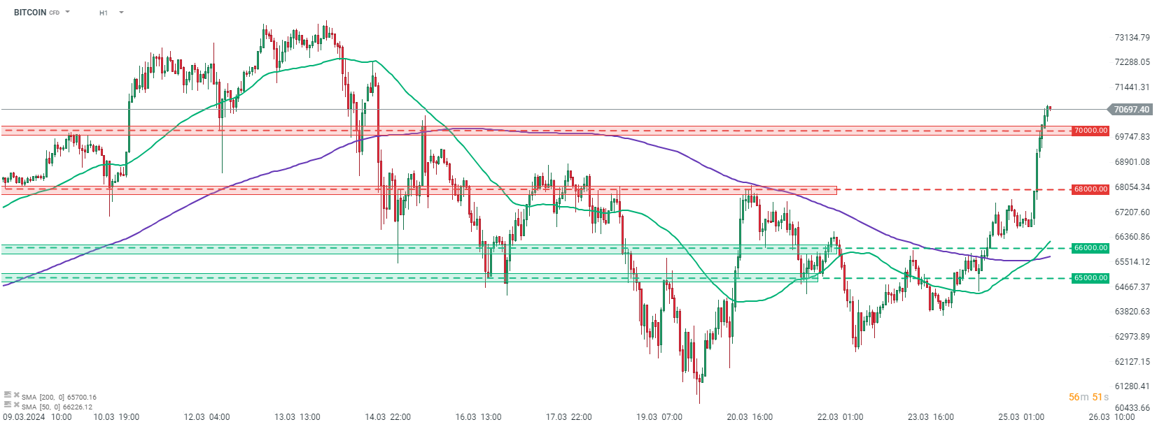 BITCOIN salta por encima de los 70.000 dólares y sube al nivel más alto desde el 15 de marzo de 2024. Fuente: xStation5