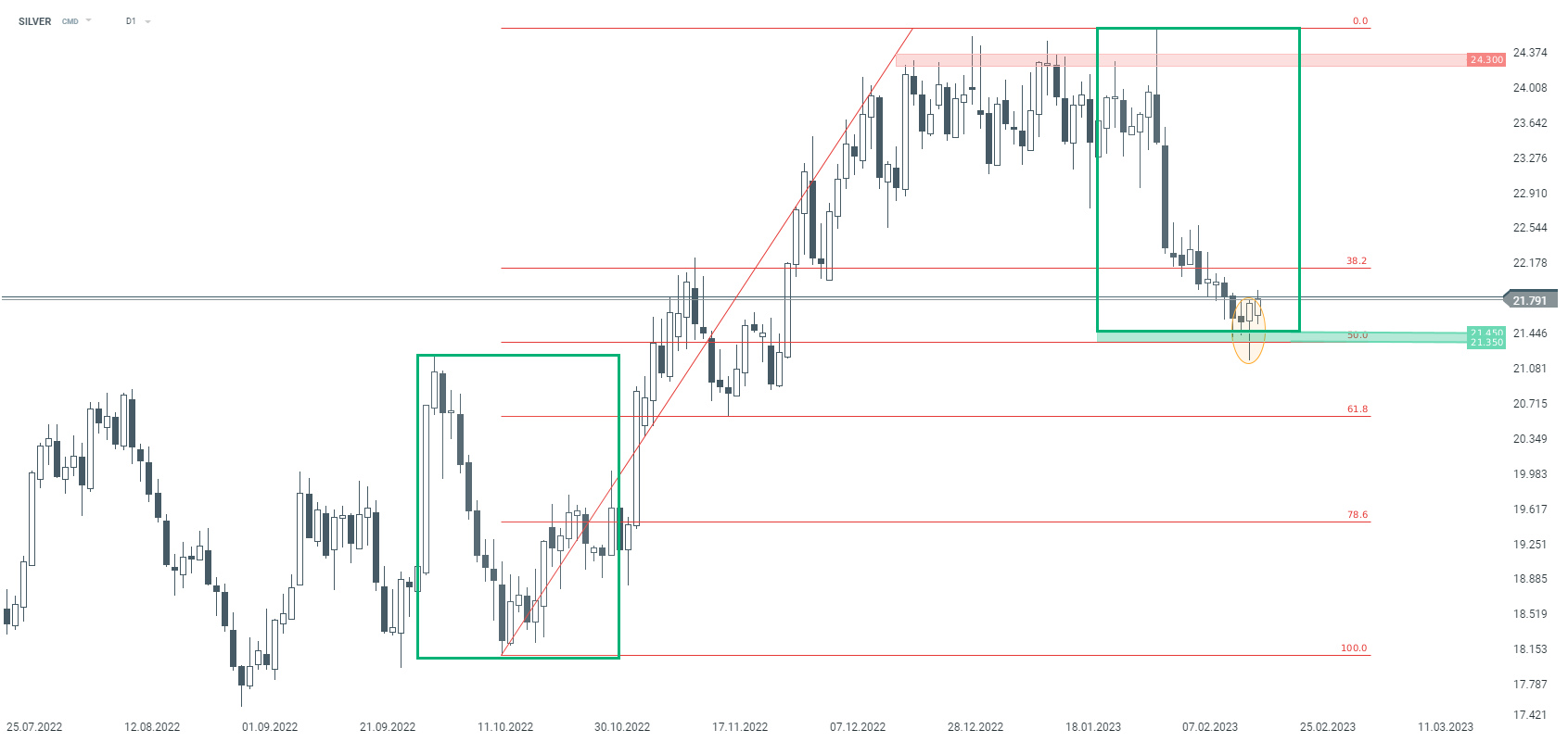 La plata (Silver) rebotó en la zona de soporte clave alrededor de $ 21.35-21.45 el viernes, que está marcada con el límite inferior de la estructura 1: 1 y el 50% de retroceso de Fibonacci de la última ola alcista. Además, ha aparecido una formación de martillo en el intervalo D1, lo que puede ser una señal de que la reciente corrección a la baja puede haber llegado a su fin. Fuente: xstation5