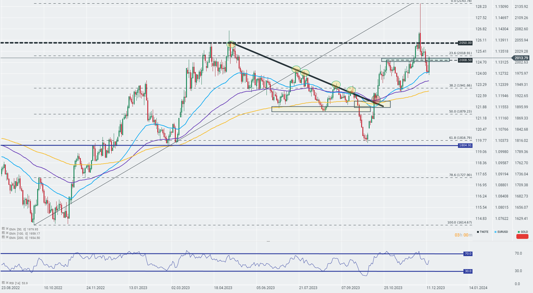 - Los comentarios de Powell parecen adoptar un tono claramente moderado. La mención del tema del primer recorte de tipos reforzó el impulso alcista en los mercados, que en general llevó al índice DJI por encima de máximos históricos. La FED explica que los tipos de interés ya se encuentran en el nivel objetivo o muy cerca de él. Sin embargo, Powell añade que si la situación lo requiere, la FED decidirá otra subida de tipos.