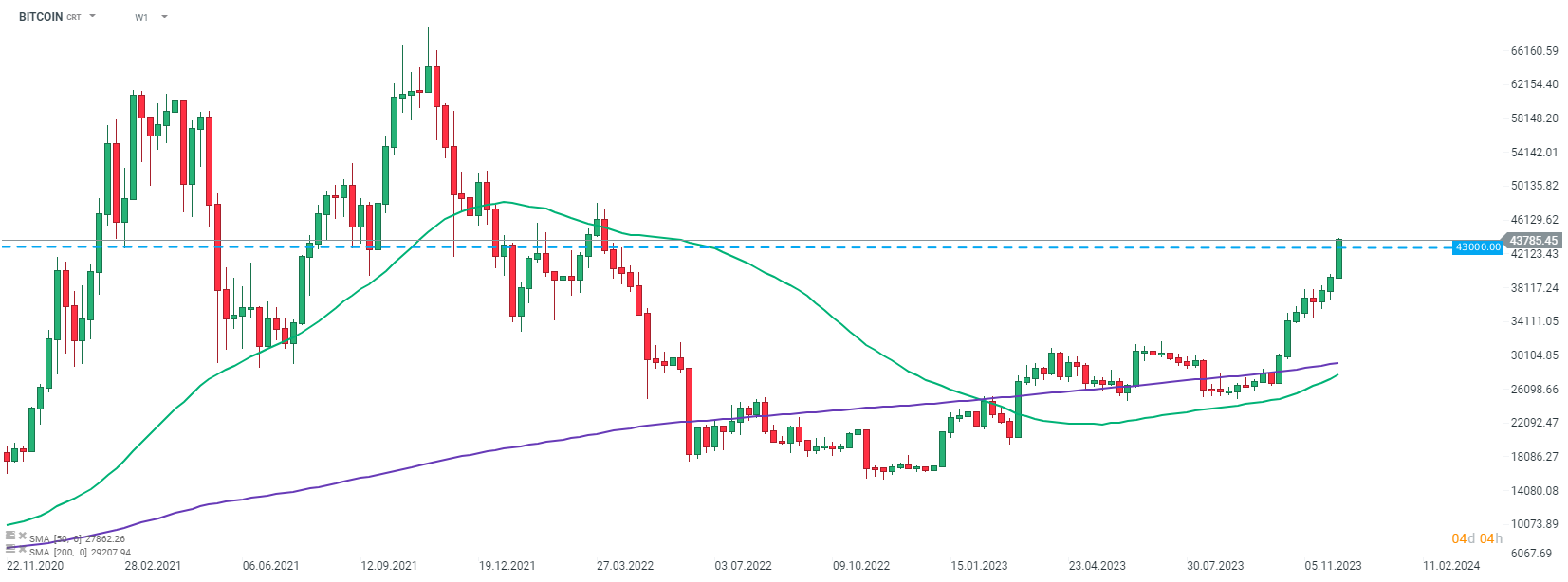 Bitcoin continúa recuperándose. La criptomoneda sube un 4% hoy, supera la marca de $43,500 y cotiza al nivel más alto desde principios de abril de 2022. Fuente: xStation5