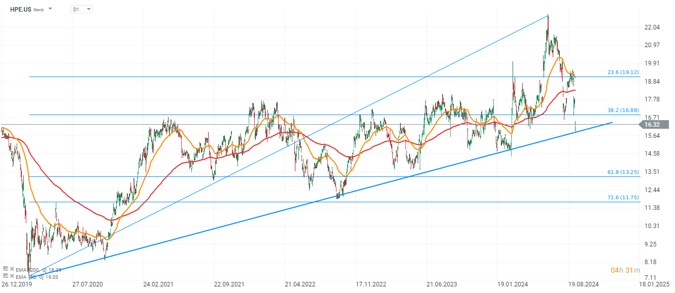 - Las acciones del gigante tecnológico estadounidense Oracle suben más del 12%, después de unos resultados sorprendentemente sólidos del segundo trimestre para el año, impulsados por su sector de servicios de nube e inteligencia artificial. A pesar de eso, la compañía no logró mejorar los sentimientos generales en el sector tecnológico, donde Hewlett Packard cae casi un 8% hoy, cayendo por debajo de la EMA200