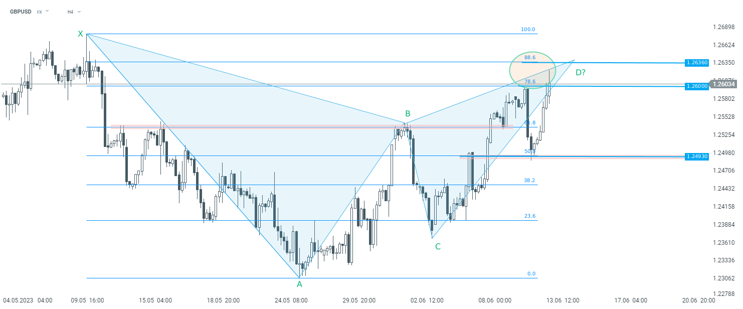 Se puede observar un potencial patrón armónico XABCD en desarrollo en GBPUSD. Al analizar el gráfico en el intervalo H4, podemos ver que el par está probando una zona de resistencia marcada con retrocesos del 78.6% y 88.6%. Si se produce una reacción en la oferta en este nivel, no se puede descartar un posible cambio de tendencia bajista. Por otro lado, una ruptura por encima de 1.2636 podría abrir el camino para más subidas y un nuevo máximo local. Fuente: xStation5.