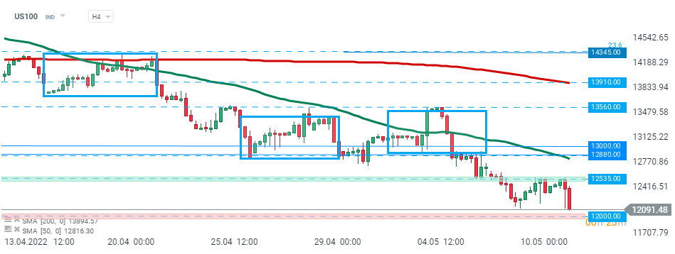 El US100 entró en territorio positivo al comienzo de la sesión de EE. UU., sin embargo, los compradores no lograron mantener el impulso y el índice reanudó el movimiento a la baja por la noche y alcanzó un nuevo mínimo del año. El soporte principal más cercano se encuentra en 12000 pts. Fuente: xStation5
