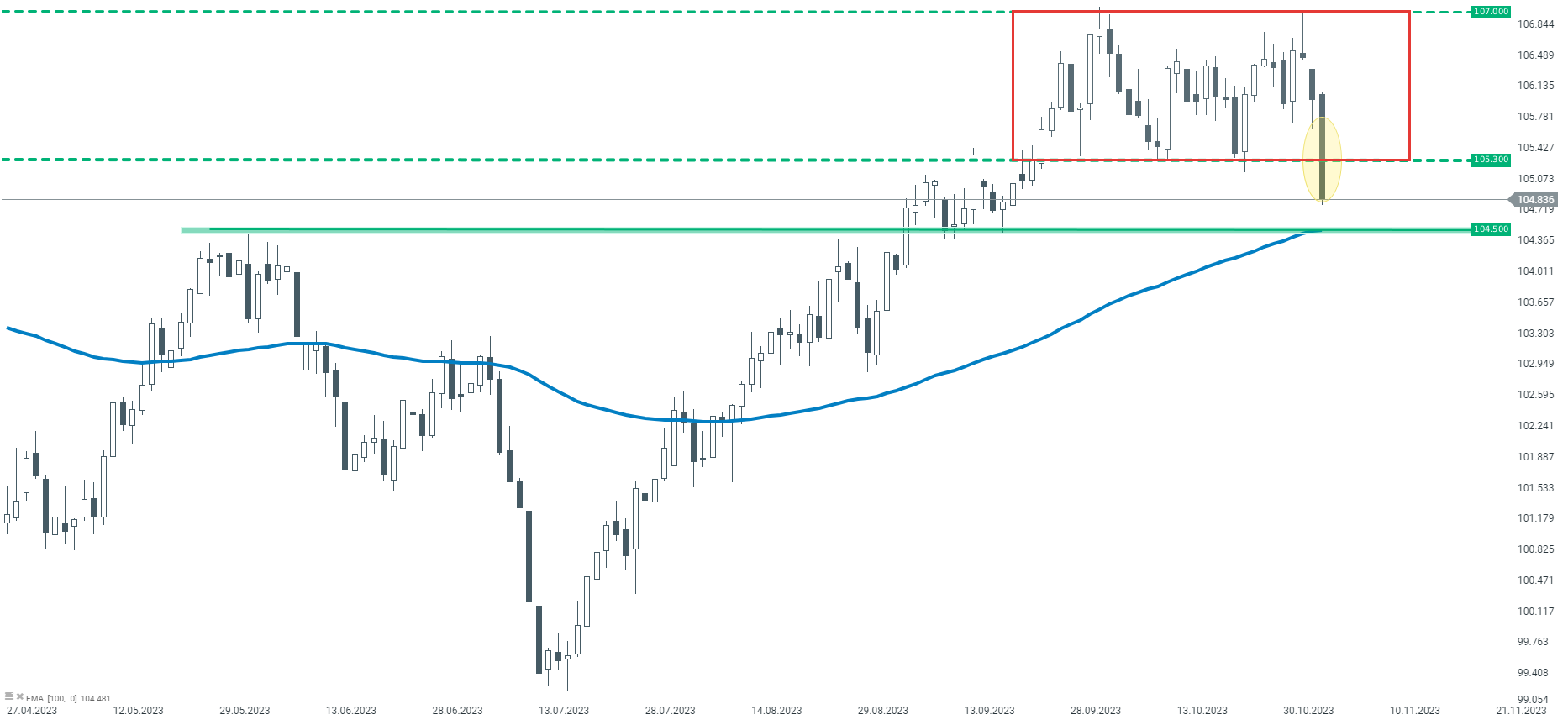 El índice del dólar se desploma debido a la consolidación local, lo que puede llevar a una prueba de soporte en 104,50, como resultado de la EMA de 100 y reacciones anteriores de los precios. Fuente: xStation5