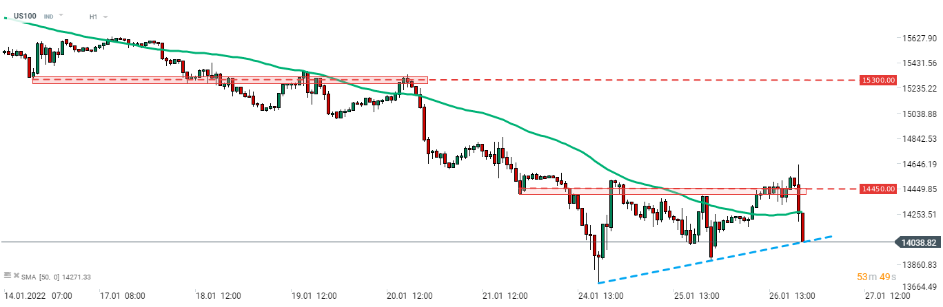 US100 hizo un intento fallido de romper por encima de la zona de resistencia de 14,450 pts hoy. Los comentarios agresivos de Powell presionaron los índices por la noche, empujando al US100 de vuelta a la línea de tendencia alcista. Fuente: xStation5