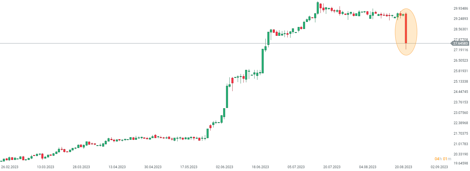Una masiva subida de tipos por parte del CBRT provocó un aumento en el mercado de la lira turca (TRY). El par EUR/TRY ha caído alrededor de un 6.5% en el día y se negocia al nivel más bajo en 2 meses. Fuente: xStation5.