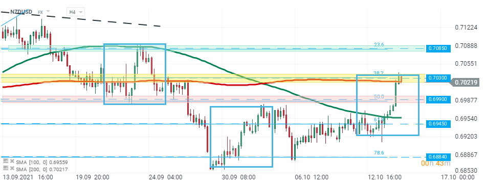 NZDUSD El par subió bruscamente durante la sesión de hoy y actualmente está probando una zona de resistencia importante alrededor de 0.7030 que está marcada con el límite superior de la estructura 1: 1, 200 SMA (línea roja) y 38.2% de retroceso de Fibonacci de la última ola ascendente. Si se produce una ruptura al alza, el movimiento alcista puede acelerarse hacia la siguiente resistencia en 0.7085, que coincide con el 23.6% de retroceso de Fibonacci. Por otro lado, si los vendedores logran recuperar el control, el soporte en 0.6990 puede estar en riesgo. Fuente: xStation5