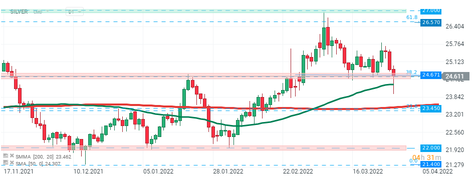 El precio de la plata cayó bruscamente durante la sesión europea, sin embargo, los compradores lograron recuperar el control después de que los comerciantes estadounidenses se unieran al mercado. El precio borró la mayoría de las pérdidas iniciales y regresó por encima del soporte principal en  24,67$, lo que coincide con el retroceso de Fibonacci del 38,2% de la última corrección importante a la baja. Fuente: xStation5