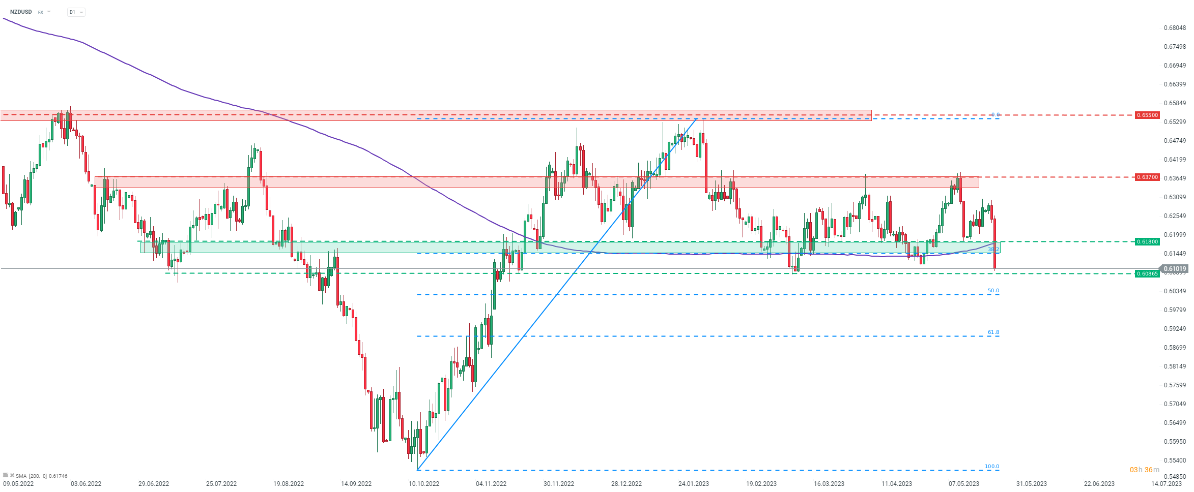 NZDUSD está haciendo un movimiento masivo a la baja hoy, ya que el USD recibió una oferta de rendimientos crecientes y el NZD se desplomó en el anuncio de pausa de aumento de tipos del RBNZ. El par cayó por debajo de la zona de soporte marcada con la media móvil de 200 sesiones y un retroceso del 38,2%, y se movió a un mínimo de 2,5 meses. Fuente: xStation5