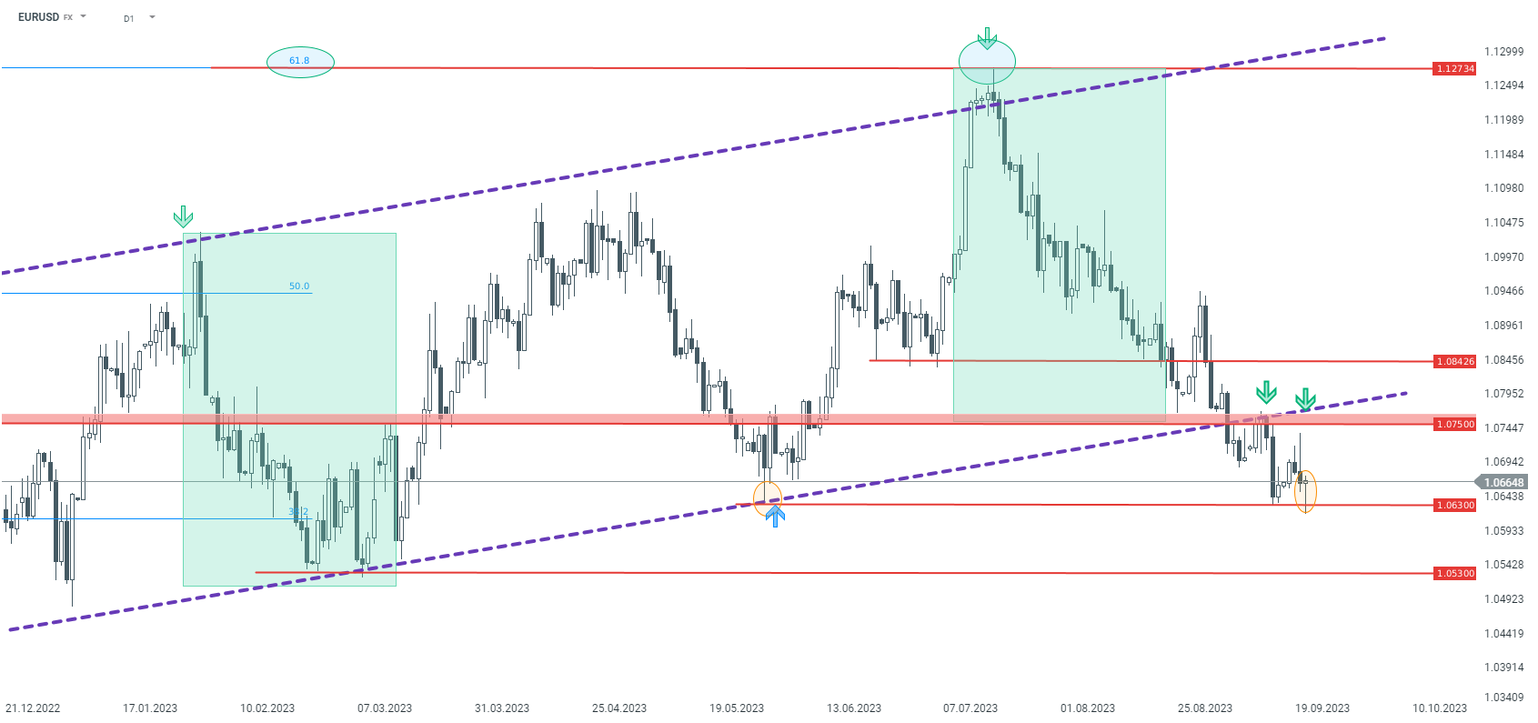 Se está formando un posible patrón alcista de velas en el par EUR/USD en el gráfico D1. Sin embargo, si los alcistas no logran tomar el control del mercado y el par cae por debajo del soporte de 1.0630, las caídas pueden profundizarse hacia 1.0530. Fuente: xStation5.