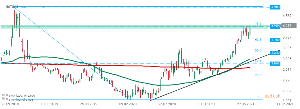 El precio del gas natural (NATGAS) subió casi un 7% y actualmente está probando una resistencia importante en $ 4.20, que es el nivel más alto desde diciembre de 2018 después de que el informe de la EIA mostrara inventarios mucho más reducidos de lo esperado. Si se produce una ruptura al alza, el movimiento alcista puede acelerarse hacia los máximos de diciembre de 2018 en $ 4,90. Por otro lado, si los vendedores logran recuperar el control, el soporte principal más cercano se encuentra en $ 3.70 y se ve reforzado por el retroceso de Fibonacci de 61.8 de la última ola bajista. Fuente: xStation5