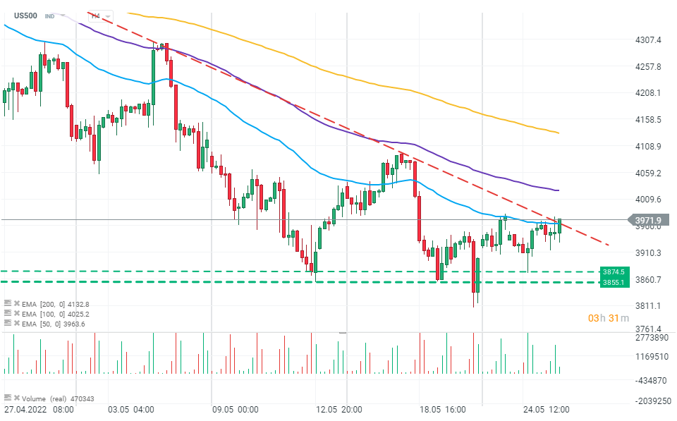 Gráfico de índice US500, intervalo H4. Las 500 empresas más grandes de EE. UU. de referencia están al alza y superan la barrera mencionada anteriormente del límite de tendencia alcista (línea discontinua roja). Fuente: xStation 5