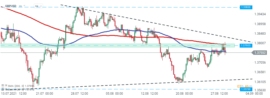 El par GBPUSD lanzó la sesión de hoy al alza, sin embargo, los compradores no lograron superar la resistencia en 13790, que coincide con 200 SMA (línea roja). Actualmente, el par está probando EMA100 (línea violeta). Si se produce una ruptura a la baja, el movimiento a la baja puede acelerarse hacia el límite inferior de la formación del triángulo alrededor de 1.3620. Fuente: xStation5
