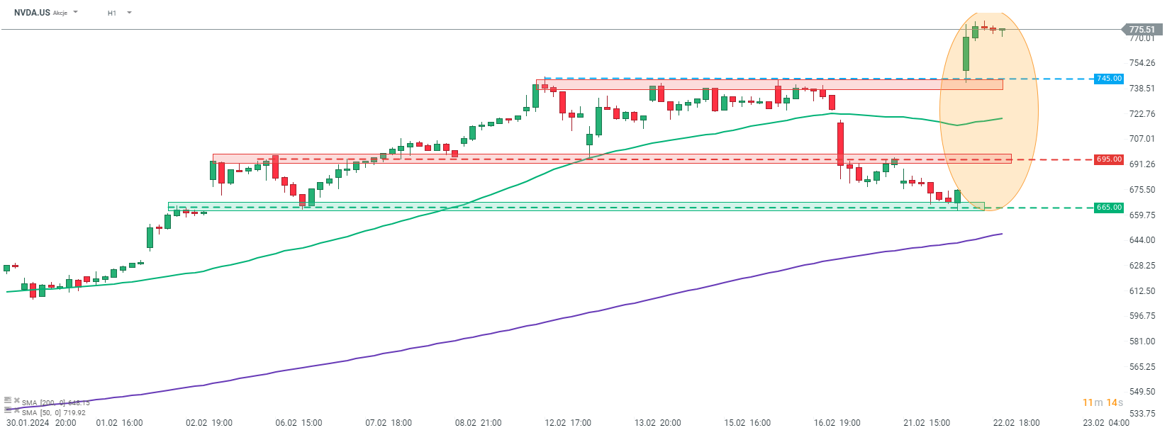 Nvidia (NVDA.US) sube alrededor del 15% hoy y respalda el sentimiento hacia todo el sector, impulsando el salto del 2,5% en el Nasdaq-100 (US100). Fuente: xStation5