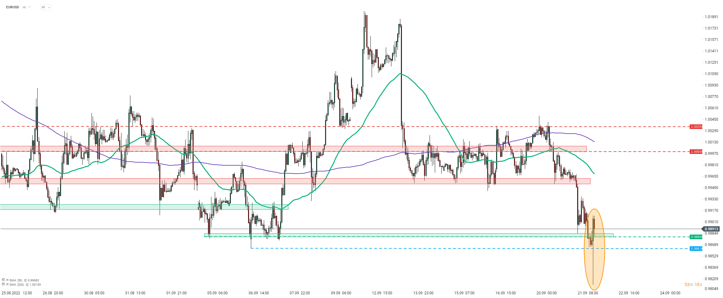 El EURUSD se desplomó a un nuevo mínimo de 20 años después del anuncio de la decisión de la Fed, ya que el dólar estadounidense se fortaleció en un gráfico de puntos de línea dura. Sin embargo, la medida se revirtió durante la conferencia de prensa de Powell. Fuente: xStation5