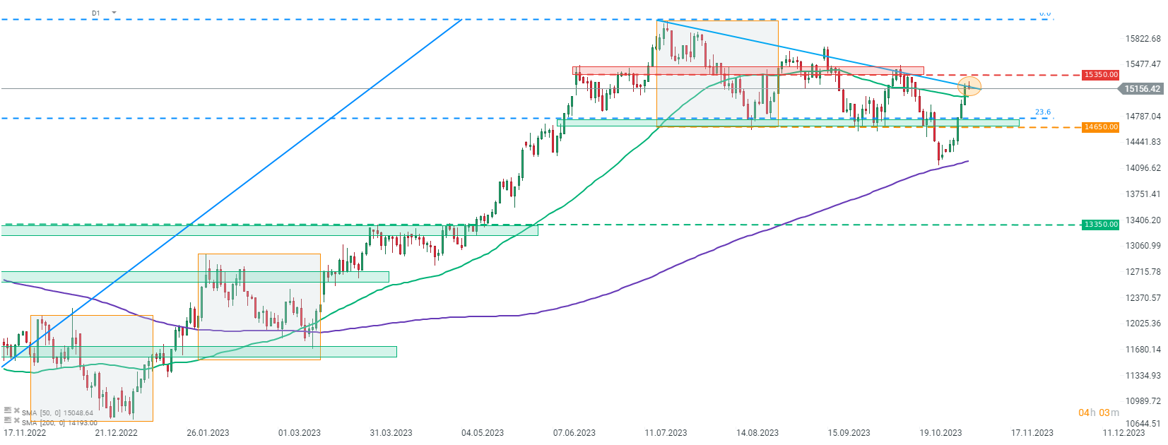 Los futuros del Nasdaq-100 borraron las caidas anteriores y ahora cotizan en negativo durante el día. El índice no logró superar la línea de tendencia bajista y el soporte más cercano se puede encontrar en el área de 14,650-14,750 pts. Fuente: xStation5