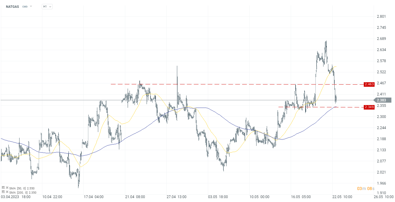 El precio del gas natural (NATGAS) ha disminuido más de un 7%, borrando las subidas de la semana pasada, marco de tiempo H1. Fuente: XStation 5.