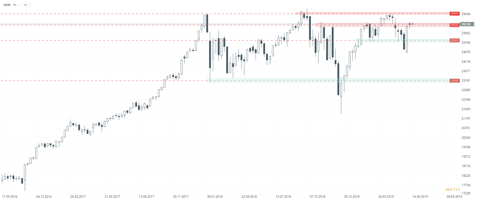 Fuente: xStation5Pasando a un marco de tiempo aún más bajo (H1), los inversores deben tener en cuenta dos niveles. La zona de 26260 es la resistencia más cercana, mientras que la zona de 25900 debe servir como soporte. La ruptura por encima de la resistencia o por debajo del soporte podría ser un desencadenante de un gran movimiento de precios en la dirección de una ruptura. Hasta ese momento, el comercio de rango parece ser el escenario base para US30.