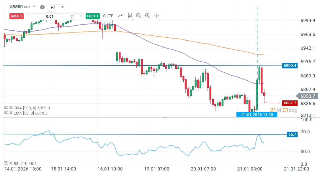 Lo que inició como la mejor sesión diaria para el S&P 500 (US500) desde noviembre, impulsada por un giro moderado en la retórica de Donald Trump en Davos, ha derivado en una jornada de alta volatilidad y reversión de ganancias. Tras un repunte inicial del 1% (que replicaba el repunte visto el pasado 19 de diciembre) y que llevó al índice a testear la zona psicológica de los 6.900 puntos, el mercado sufrió un rechazo violento, borrando el avance y registrando un descenso del 1% que sitúa al índice en terreno vulnerable.