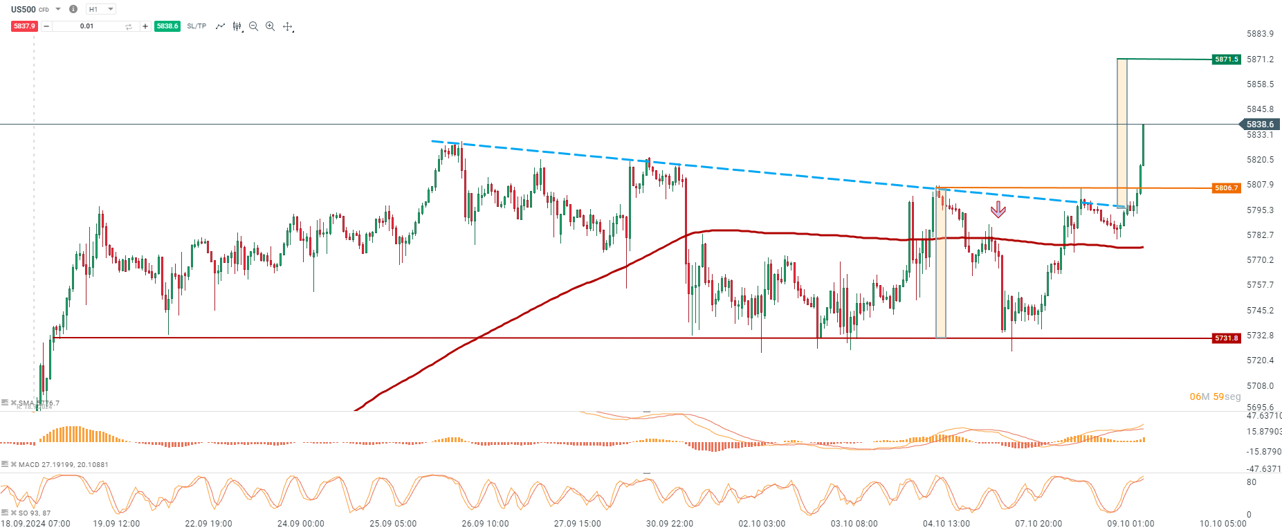 El US500 alcanza nuevos máximos históricos impulsado por las ganancias en el sector tecnológico y financiero y a la espera de las actas de la Fed. El índice ha roto la secuencia de máximos decrecientes, superando la resistencia en 5806.7, con un aumento significativo de la volatilidad, proyectando un objetivo técnico mínimo en 5871.