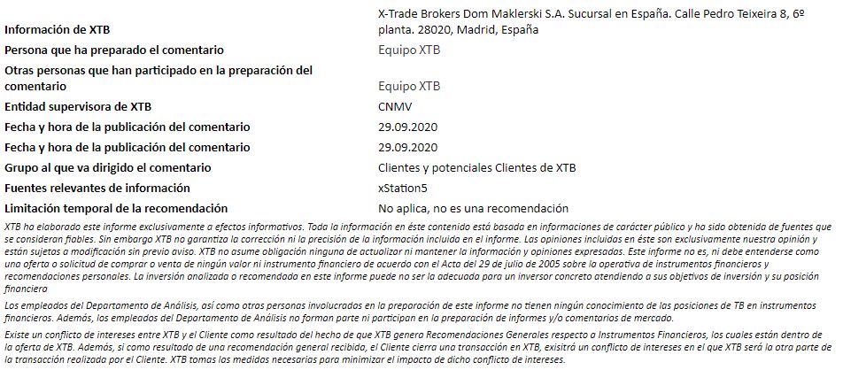 "Este informe se proporciona sólo con fines de información general y con fines educativos. Cualquier opinión, análisis, precio u otro contenido no constituyen asesoramiento de inversión o recomendación en entendimiento de la ley de Belice. El rendimiento en el pasado no indica necesariamente los resultados futuros, y cualquier persona que actúe sobre esta información lo hace bajo su propio riesgo. XTB no aceptará responsabilidad por ninguna pérdida o daño, incluida, sin limitación, cualquier pérdida de beneficio, que pueda surgir directa o indirectamente del uso o la confianza de dicha información. Los contratos por diferencias (""CFDs"") son productos con apalancamiento y acarrean un alto nivel de riesgo. Asegúrese de comprender los riesgos asociados. "