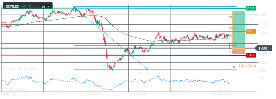 El miedo de los inversores a que una segunda ola de casos por coronavirus puede dañar el crecimiento económico es la principal incertidumbre para la bolsa española. Sería interesante minimizar el riesgo de la operación en la multinacional situando un stop-loss justo por debajo de los mínimos locales en los 1,48 euros. El valor acaba de perder la media móvil de 100 sesiones (linea gris) que actuaba como soporte.