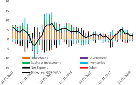 El crecimiento chileno se ha enfriado en medio de la desaceleración mundial, los menores precios del cobre y la mayor dependencia del consumo privado. Por lo tanto, las protestas pueden perturbar la economía. Para los inversores será crucial cómo abordará el gobierno la situación, ya que un aumento importante en el gasto no sería bienvenido por 2 razones: deuda externa alta (y creciente) de alrededor del 70% del PIB y deuda pública moderada pero en rápido aumento. La decisión de "comprar" al público podría no ser bien recibida por los mercados. Por otro lado, Chile es una economía relativamente abierta y tiene un déficit moderado en cuenta corriente del 2% del PIB. La depreciación reciente del peso debería ayudar a cerrar el déficit y proporcionar un soporte a la moneda (a diferencia de Argentina el año pasado), aunque también incrementará (aún más) el coste de vida.