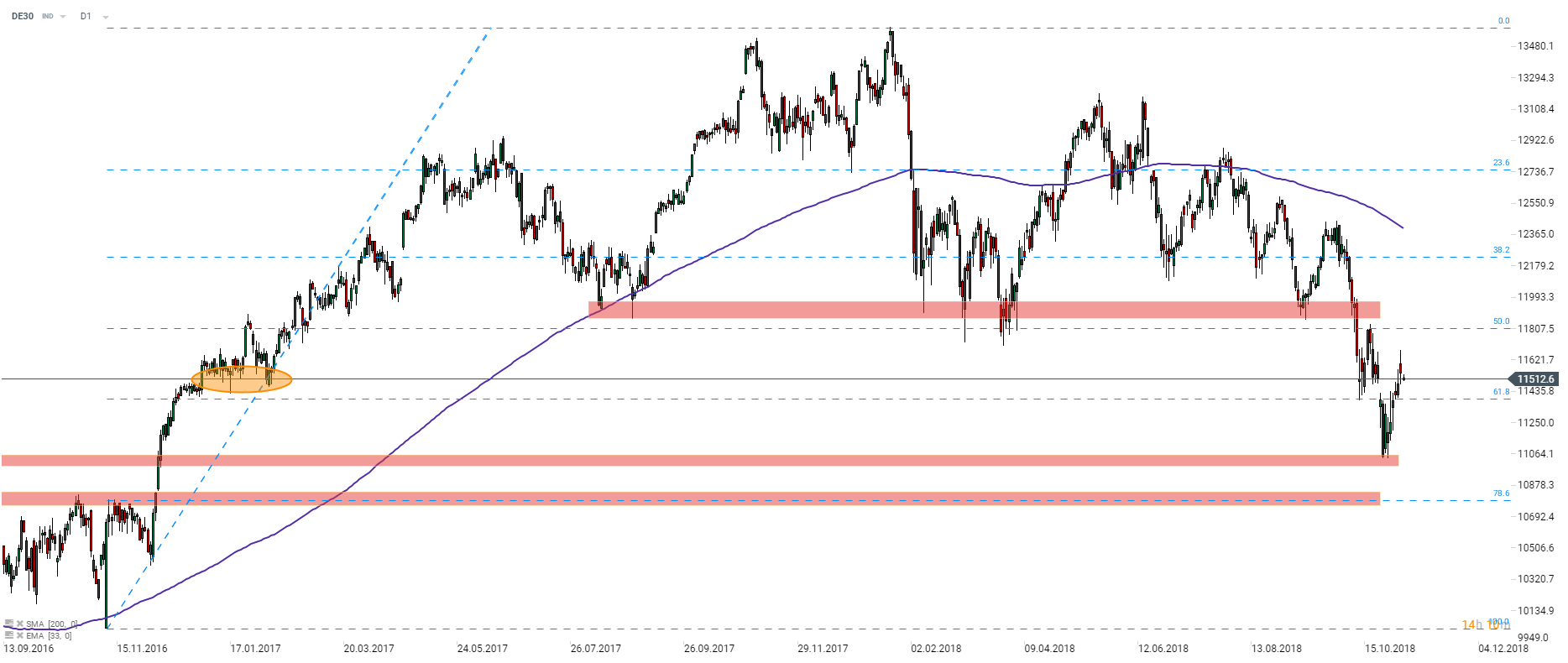El DE30 logró escalar al área de 11500 pts donde se puede encontrar el nivel de swing desde principios de 2017 (círculo naranja). Sin embargo, el índice no rompió por encima de esta zona y puede verse un retroceso hacia el nivel de Fibo del 61,8% del impulso ascendente iniciado a finales de 2016. Fuente: xStation5