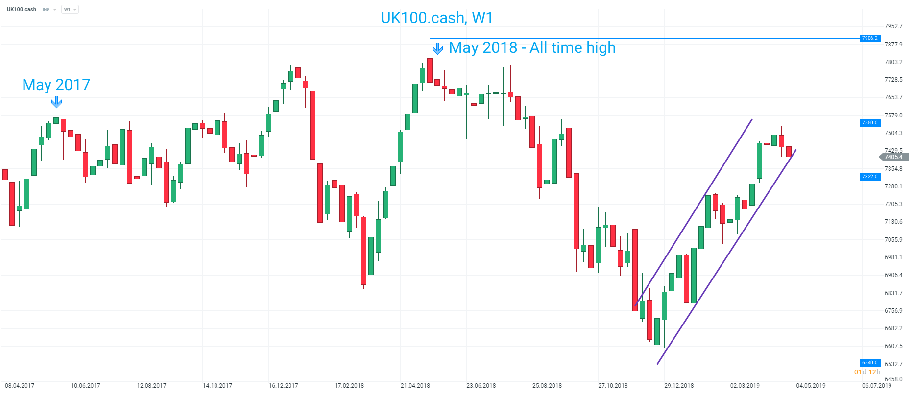 El FTSE ha alcanzado su punto máximo en mayo en cada uno de los últimos dos años, con 2018 viendo el máximo histórico de 7906 publicado. ¿Tendremos más debilidad este mayo? Fuente: xStation