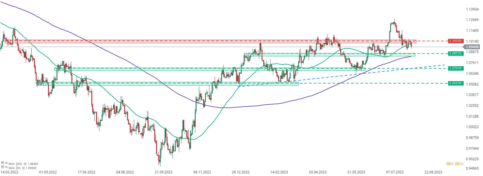 El par EUR/USD no logró romper nuevamente por encima de la zona de resistencia de 1.1025, marcada con máximos locales anteriores y la media móvil de 50 sesiones (línea verde). El par está cayendo hoy a medida que el USD se fortalece debido a las entradas en activos seguros. Si observamos una ruptura por debajo de los recientes mínimos locales en el área de 1.0920, el siguiente objetivo para los bajistas será la zona de soporte en 1.0875. Fuente: xStation5.
