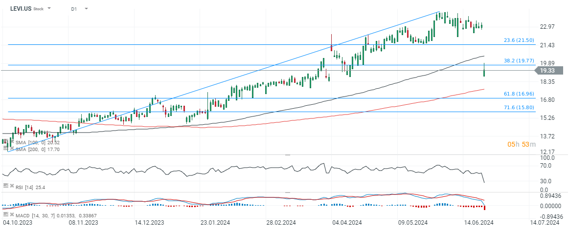 Las acciones de Levi's & Strauss cotizan casi un 20% por encima de su media móvil de 200 sesiones. Fuente: xStation5