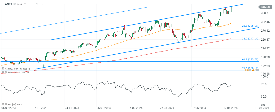 Arista Networks (ANET.US) ya logró recuperarse casi un 40% desde su mínimo local en abril y cotiza hoy en nuevos máximos históricos. Citi elevó hoy su recomendación para la compañía de "comprar" con un precio objetivo de 385 dólares por acción.