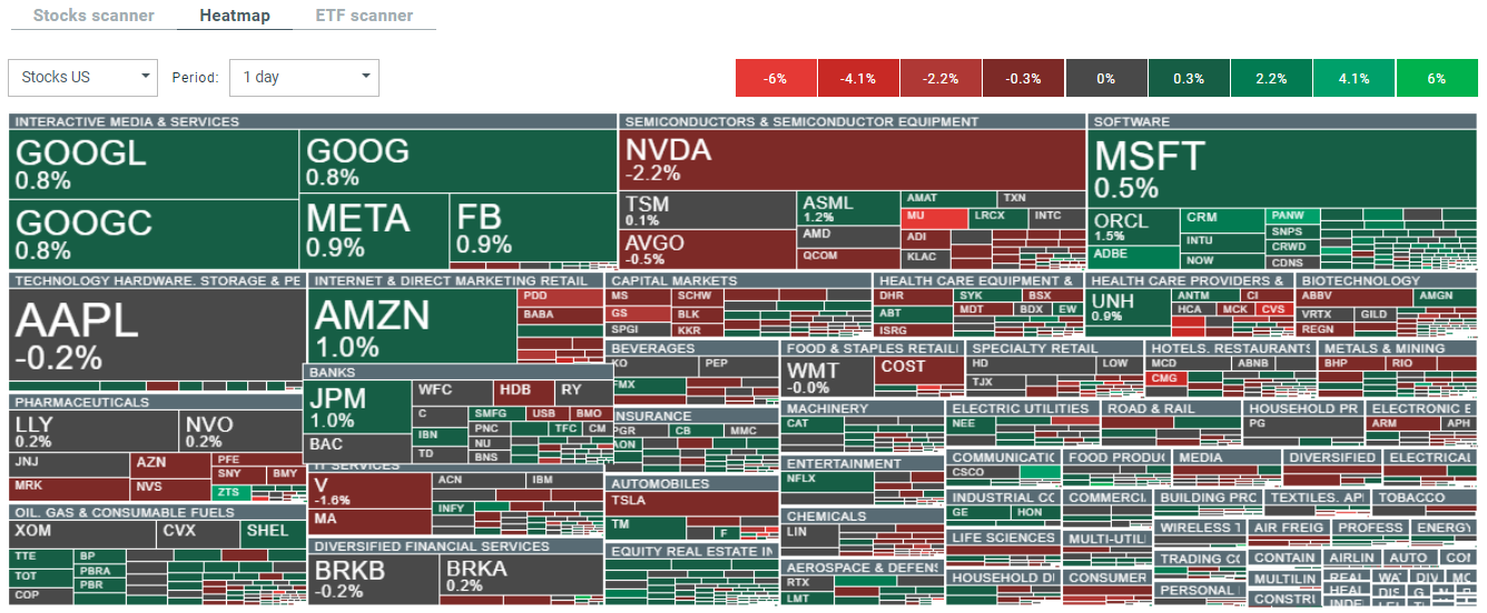 Hoy se observa un sentimiento notablemente más débil en los sectores de semiconductores y automoción. Las acciones de Goldman Sachs (GS.US) también están perdiendo más del 2%. Fuente: xStation5