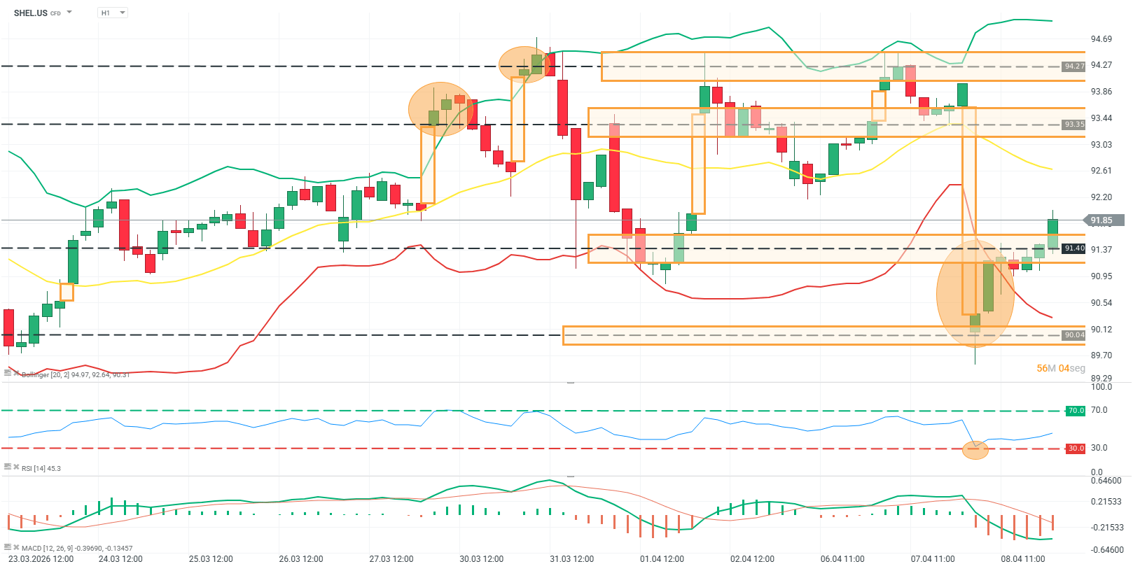 El precio de SHEL.US en H1 se mantiene dentro de una estructura lateral amplia tras un impulso alcista previo, con el movimiento reciente oscilando entre la zona de soporte en torno a 90.04–91.40 y la resistencia ubicada en 93.35–94.27. Tras el rechazo observado en la parte alta del rango, el precio experimenta una corrección profunda que encuentra demanda en la zona baja, desde donde se produce un rebote técnico que devuelve al activo hacia niveles intermedios. La media móvil se encuentra relativamente plana, reflejando ausencia de tendencia clara, mientras que las bandas de Bollinger muestran contracción tras episodios de expansión, señalando un entorno de consolidación.