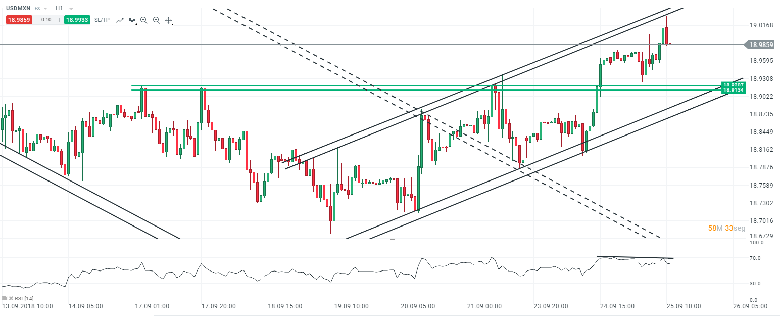 En este contexto, encontramos al USDMXN cotizando en la parte más alta de un canal alcista que está guiando los precios en el rebote que inició el pasado día de 19 de septiembre, donde comenzamos a detectar ciertas divergencias bajistas en su indicador RSI.