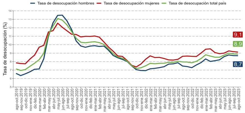 La tasa de Desempleo en Chile se mantuvo constante en 8,9%, sin variaciones respecto al dato anterior. Este resultado superó las expectativas del mercado, que preveían una reducción del 0,1% en el indicador. De hecho, se registró un incremento de 0,9 puntos porcentuales en los últimos 12 meses. Este dato muestra un debilitamiento del mercado laboral en Chile, llegando a niveles que no se habían observado desde agosto de 2021.