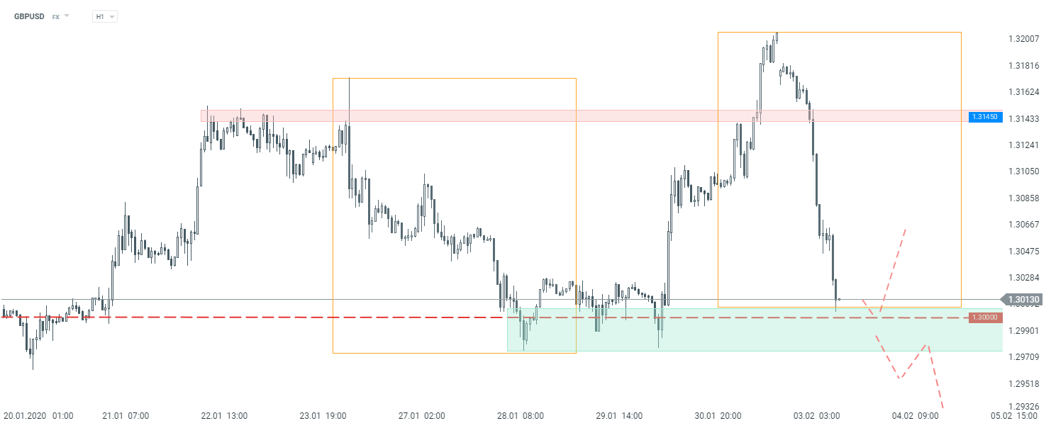 GBPUSD is trading today lower due to Borish Johnson’s threat about UK-EU negotiations and better release of ISM data from US. The pair erased recent gains and it is currently testing the key support zone at 1.30 USD. This area is marked with the lower limit of Overbalance pattern, recent price reactions and psychological level. If buyers manage to stop declines here, a bullish signal would be generated. On the other hand, a break below could trigger a bigger downward move.