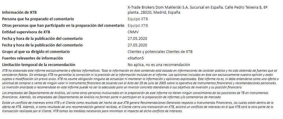 "Este informe se proporciona sólo con fines de información general y con fines educativos. Cualquier opinión, análisis, precio u otro contenido no constituyen asesoramiento de inversión o recomendación en entendimiento de la ley de Belice. El rendimiento en el pasado no indica necesariamente los resultados futuros, y cualquier persona que actúe sobre esta información lo hace bajo su propio riesgo. XTB no aceptará responsabilidad por ninguna pérdida o daño, incluida, sin limitación, cualquier pérdida de beneficio, que pueda surgir directa o indirectamente del uso o la confianza de dicha información. Los contratos por diferencias (""CFDs"") son productos con apalancamiento y acarrean un alto nivel de riesgo. Asegúrese de comprender los riesgos asociados. "