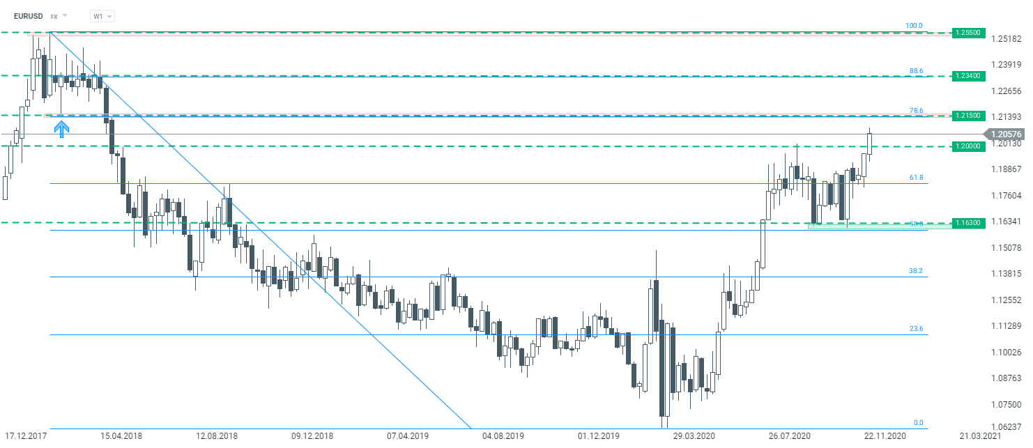 Comencemos el análisis de hoy con el gráfico EURUSD. Mirando el marco de tiempo semanal, podemos ver que el par rompió por encima de la resistencia en 1.20, lo que confirmó que el par permanece en una tendencia alcista. Siempre que el precio se mantenga por encima, la continuación de un movimiento ascendente es el escenario base. La resistencia más cercana a observar se encuentra en 1.2150, donde se puede encontrar el retroceso de Fibonacci del 78.6% y un mínimo de febrero de 2018. En caso de que el par supere este obstáculo, el siguiente nivel a observar se encuentra en la siguiente medición de Fibonacci: 88,6%.