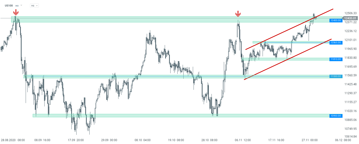 El índice tecnológico de EE. UU. (US100) alcanzó un nuevo máximo histórico ayer, pero hoy podemos ver un movimiento de corrección local. Mirando el intervalo H4, podemos ver que el precio se encuentra en el área de resistencia en 12,400 pts. Si los vendedores logran tomar el control, el límite inferior del canal ascendente local cerca de 12,065 pts podría ser el primer objetivo potencial. En caso de que veamos una corrección a la baja más grande, se debe prestar atención a las áreas de soporte horizontal marcadas con color verde.Por otro lado, el área de 12,400 pts antes mencionada es la última resistencia visible en el gráfico y si el índice se rompe por encima, un movimiento hacia un territorio inexplorado estará en juego.