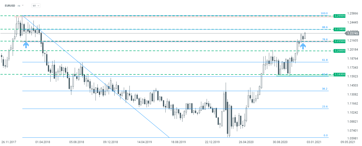 EURUSD ha estado operando en una tendencia alcista recientemente. El par rompió por encima del retroceso de Fibonacci del 78,6% y, después de la corrección local, los alcistas utilizaron este nivel como soporte. Según el análisis técnico clásico, siempre que el precio se sitúe por encima del nivel de 1,2250, el mayor movimiento alcista es el escenario base. La resistencia más cercana a observar se encuentra en el próximo retroceso de Fibonacci: 88,6%. Si el precio se rompe por encima de él, el camino hacia los máximos de 2018 quedará abierto.