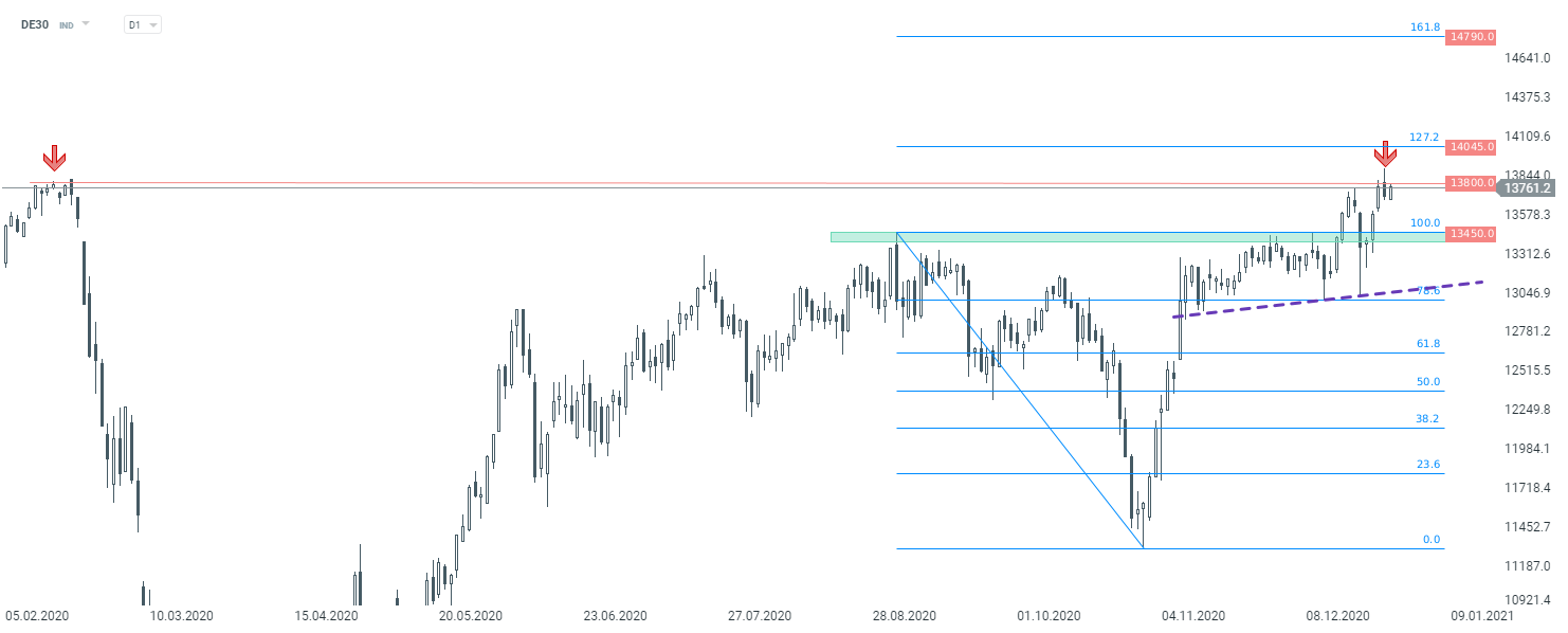 El índice alemán subió a nuevos máximos históricos ayer, pero los compradores no lograron mantener el impulso y el índice retrocedió. La vela diaria cerró con tono bajista porque tiene una larga sombra ascendente y el cuerpo negro. Si los vendedores usan esto como una señal de venta, el movimiento a la baja puede alcanzar el soporte en 13,450 pts, que debe considerarse como una zona de demanda clave. Por otro lado, el sentimiento actual sigue siendo alcista, y el próximo objetivo para los compradores está marcado con los retrocesos exteriores de Fibonacci (127,2% y 161,8%).