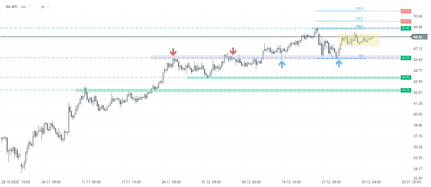 El mercado del petróleo ha estado operando en una tendencia alcista, sin embargo, el impulso se desaceleró claramente recientemente. Por el momento, aún no han surgido fuertes señales bajistas. Los compradores lograron detener las caídas en un soporte de $ 46.2 que está marcado con las reacciones de precios anteriores. Según el análisis técnico clásico, siempre que el precio se sitúe por encima de él, puede haber otro impulso alcista en las cartas. En la perspectiva de corto plazo, el precio se ha estado negociando en un movimiento lateral local que está marcado con un rectángulo amarillo, por lo que se debe esperar a que se produzca una ruptura.