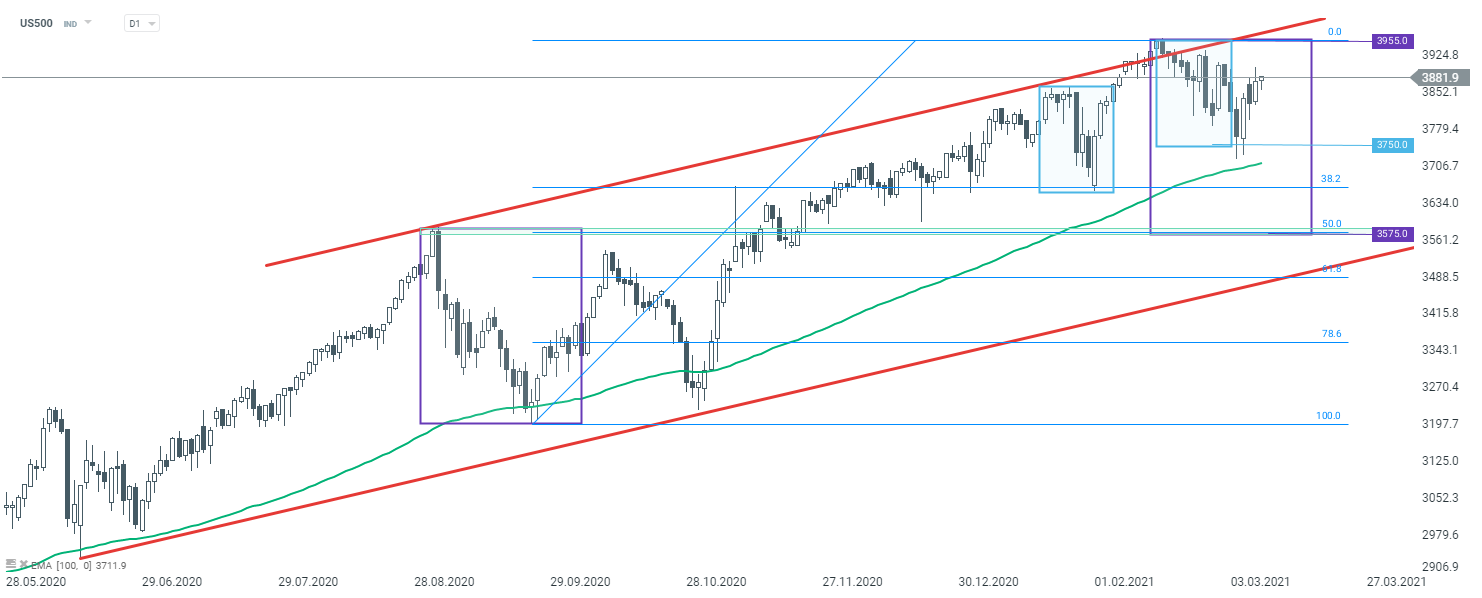 US500 ha estado operando en una tendencia alcista recientemente. La reciente corrección a la baja se detuvo en el soporte de los 3.750 pts, que está marcado con el límite inferior de la estructura local 1: 1 (rectángulo azul). Si prevalece el sentimiento actual, otro ataque al máximo histórico de 3.955 ptos parece ser el escenario base. La mayor corrección a la baja, por supuesto, puede ocurrir en cualquier momento, pero intentar determinar el tope de una tendencia alcista es una tarea desafiante. Sin embargo, si tal corrección ocurriera en el corto plazo, el soporte clave a observar se encuentra en 3.575 pts, donde se ubican el límite inferior de la estructura de Overbalance, el 50% de retroceso de FIbonacci y las reacciones de precios previas. Romper por debajo de este soporte puede llevar a un cambio de tendencia en US500.