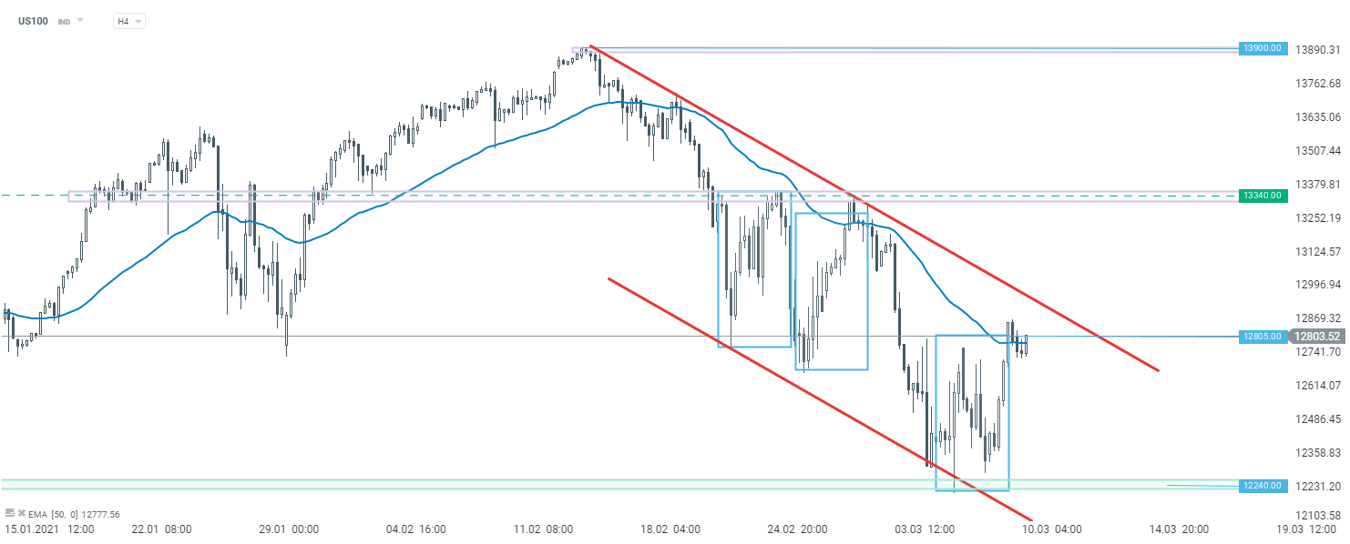 Comencemos el análisis de hoy con el índice tecnológico estadounidense: Nasdaq-100 (US100). Al observar el intervalo H4, se puede ver que justo después de que se alcanzó un nuevo máximo histórico, el índice experimentó una corrección a la baja superior al 10%. Sin embargo, los alcistas del mercado lograron detener las caídas en el soporte de 12.240 pts. Los operadores deberían prestar atención a la estructura local 1: 1 ahora (12.805 pts). Si los vendedores aparecen allí una vez más, puede comenzar otro impulso a la baja. Por otro lado, superar esta resistencia puede llevar a la reanudación de la principal tendencia alcista. El límite superior del canal descendente local puede actuar como la próxima resistencia en el corto plazo. Los vendedores también deben vigilar el área de 13.340 pts, donde se ubican las reacciones de precios anteriores.